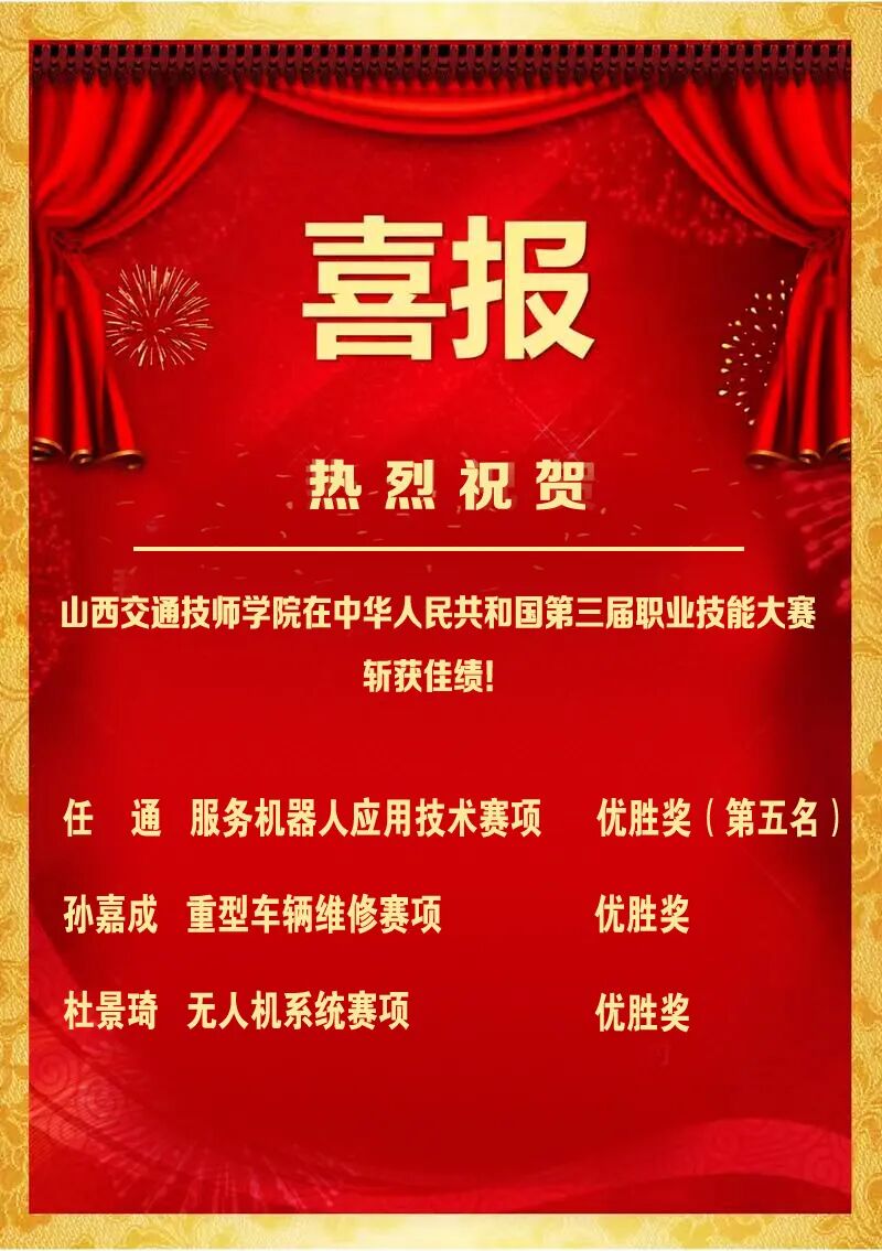 9月23日,由人力资源和社会保障部主办,河南省人民政府承办的中华人民共和国第三届职业技能大赛在郑州落下帷幕。我院5名师生代表山西省出征5个项目的角逐,荣获3个优胜奖。教师任通以服务机器人应用技术赛项第五名的好成绩,获优胜奖,位居山西代表队最好成绩前三位。学生孙嘉成获重型车辆维修赛项优胜奖,毕业生杜景琦获无人机系统赛项优胜奖,充分展示了学院品质教师、品质学生培养成果。