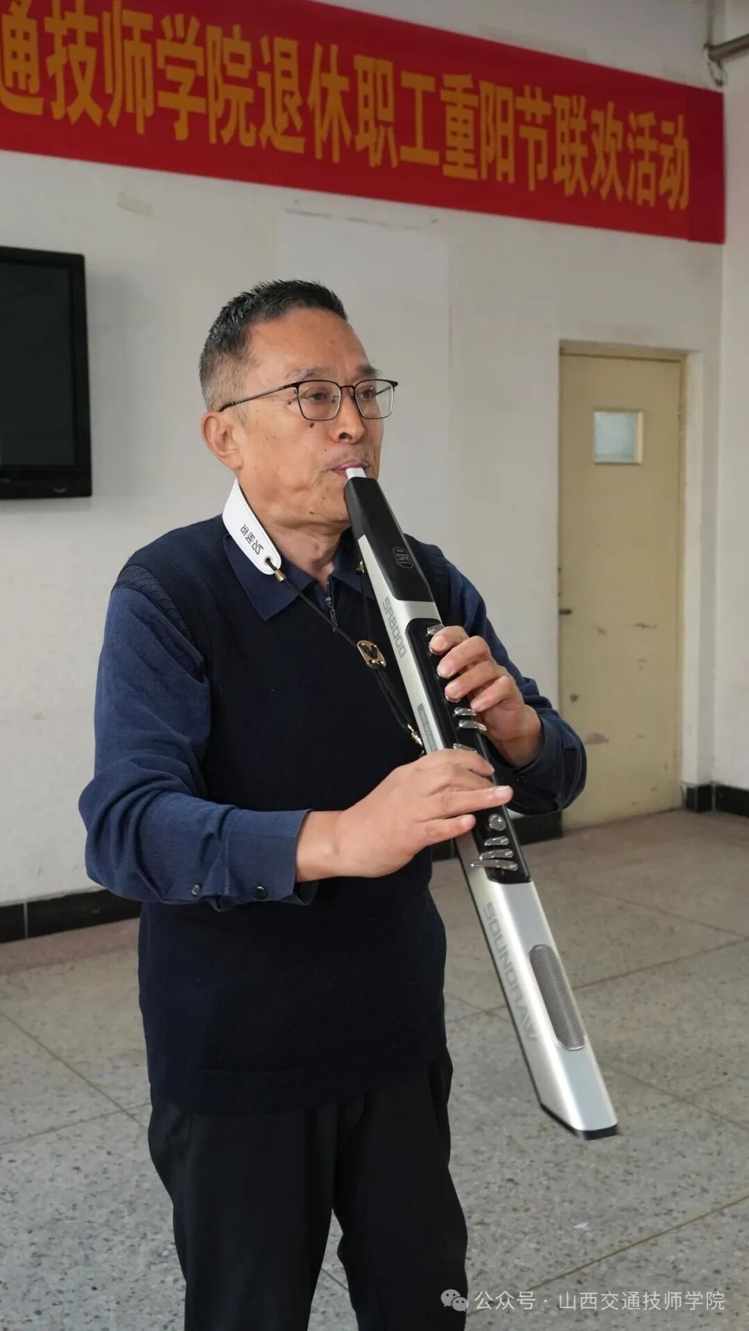 卫申蔚发表了热情洋溢的致辞。他指出,老同志们是学院发展的“奠基人”与“见证者”,为学院的建设发展筑牢了根基,更为地方交通事业的进步注入了强劲动力。学院转隶至省人社厅,即将迎来新的发展机遇,学院会一如既往地关心老同志的生活,做好服务保障,让老同志退休生活舒心、安心、暖心,一同见证学院的新成长、新跨越。并现场演奏电吹管《我的祖国》,以乐传情,为活动增添温暖色彩。