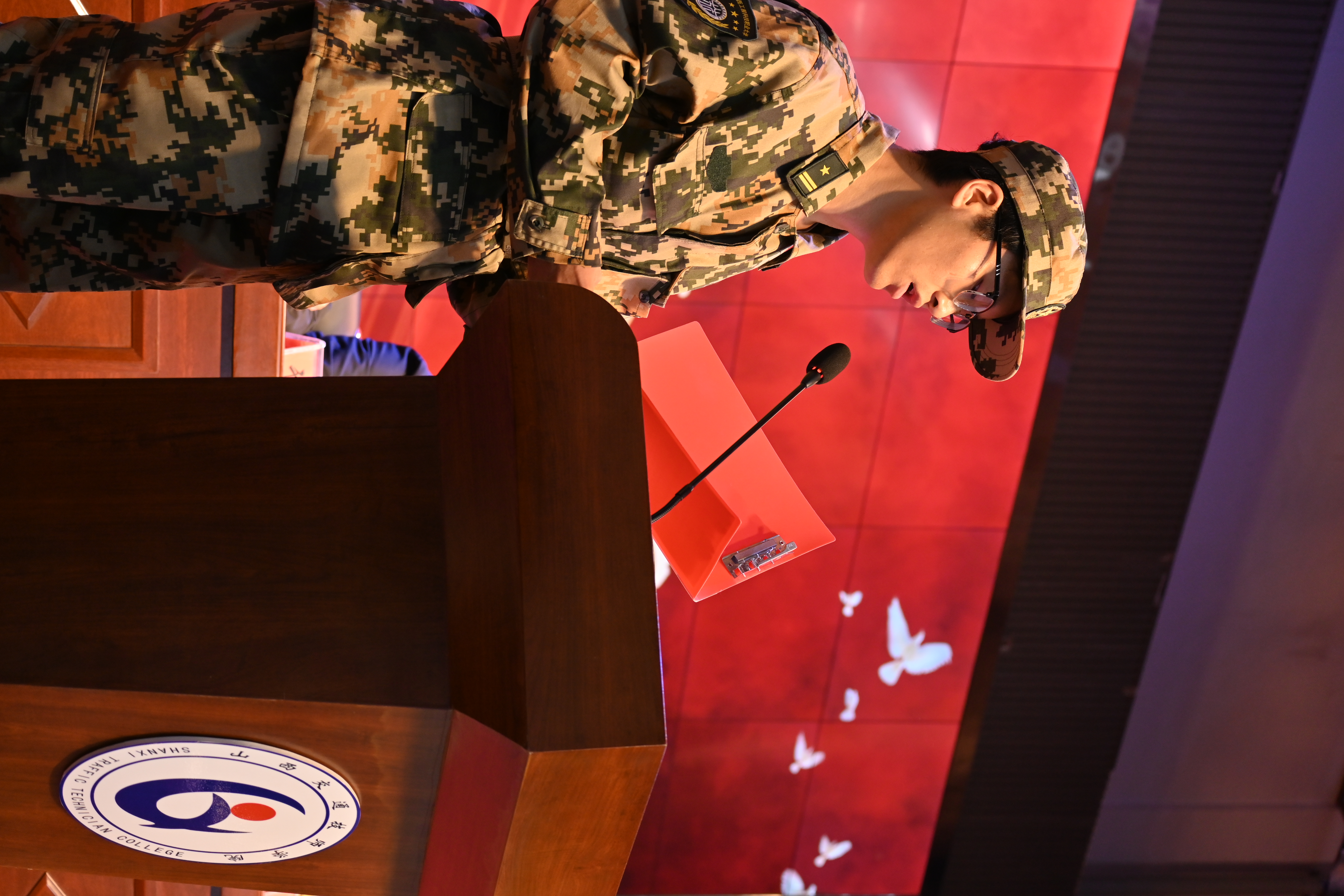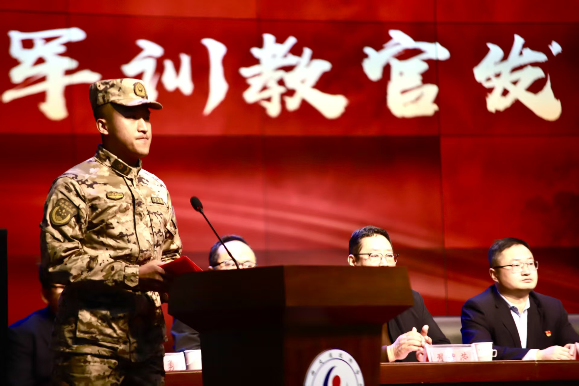 本次承训的教官代表贾学聪以军训“教练员”和“引路人”的双重身份,引导同学们充分认识军训对于意志锤炼、未来发展的重要意义,鼓励同学们青春因磨励而出彩,人生因奋斗而升华。