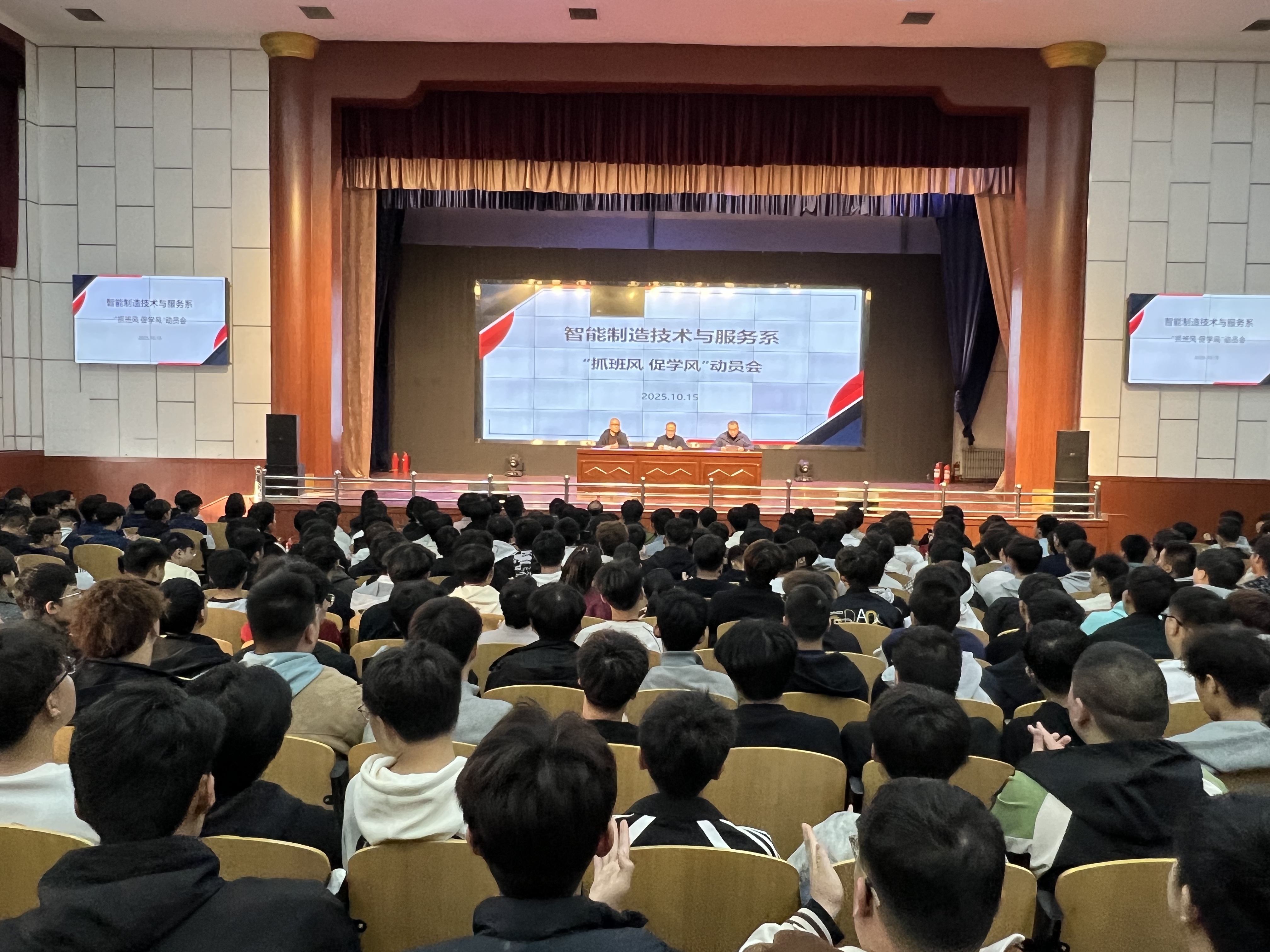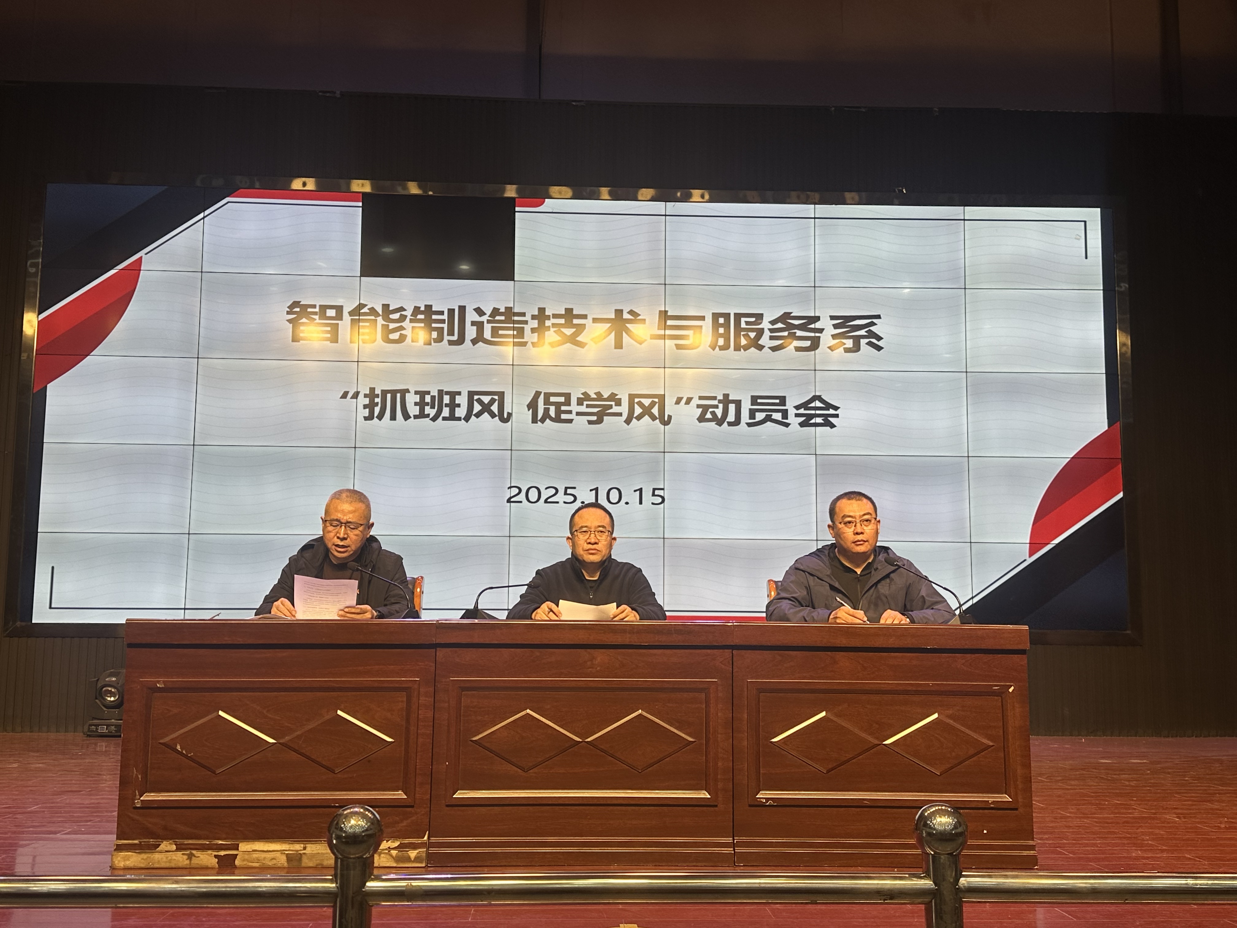 金秋送爽,硕果可期。为进一步营造积极向上、勤学善思的班级氛围与校园学习环境,明确班级建设方向、凝聚学业进步力量,智能制造技术与服务系 “抓班风、促学风” 动员大会于10月15日下午在大礼堂隆重召开。系主任吕利强、系党支部书记李俊刚,系部全体班主任老师、系部全体中高职学生参会,大会由系部第二临时负责人范江涛主持。