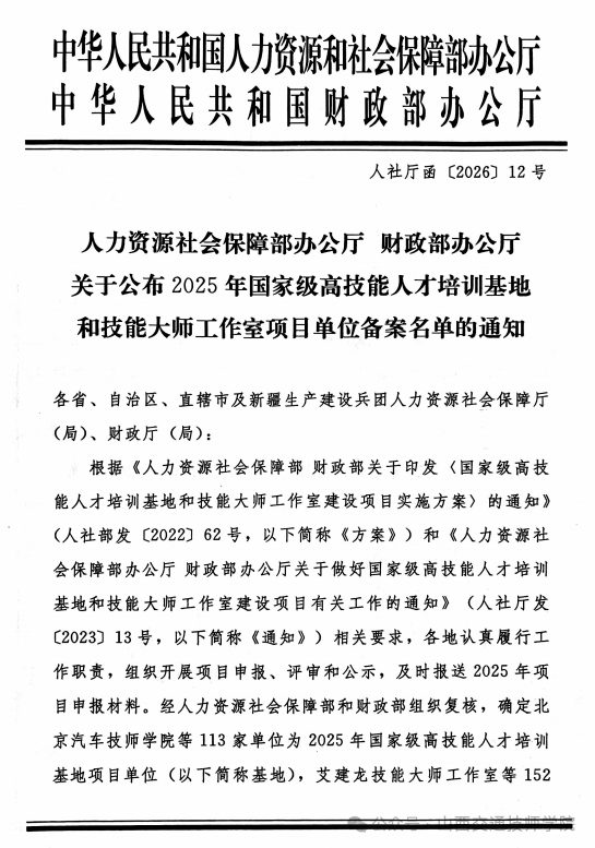 近日,人力资源社会保障部办公厅与财政部办公厅联合发布《关于公布2025年国家级高技能人才培训基地和技能大师工作室项目单位备案名单的通知》。在这份备受瞩目的“国字号”名单中,山西交通技师学院成功入选2025年国家级高技能人才培训基地项目单位,充分彰显了学院办学实力与人才培养模式受到国家级层面认可。