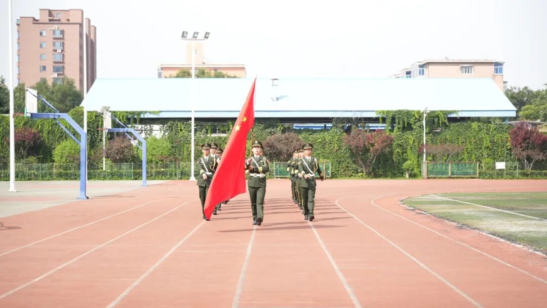 我院自主训练的国旗护卫队迈着整齐的步伐出旗,他们身姿挺拔、气宇轩昂,充分展示了我院半军事化管理成果。