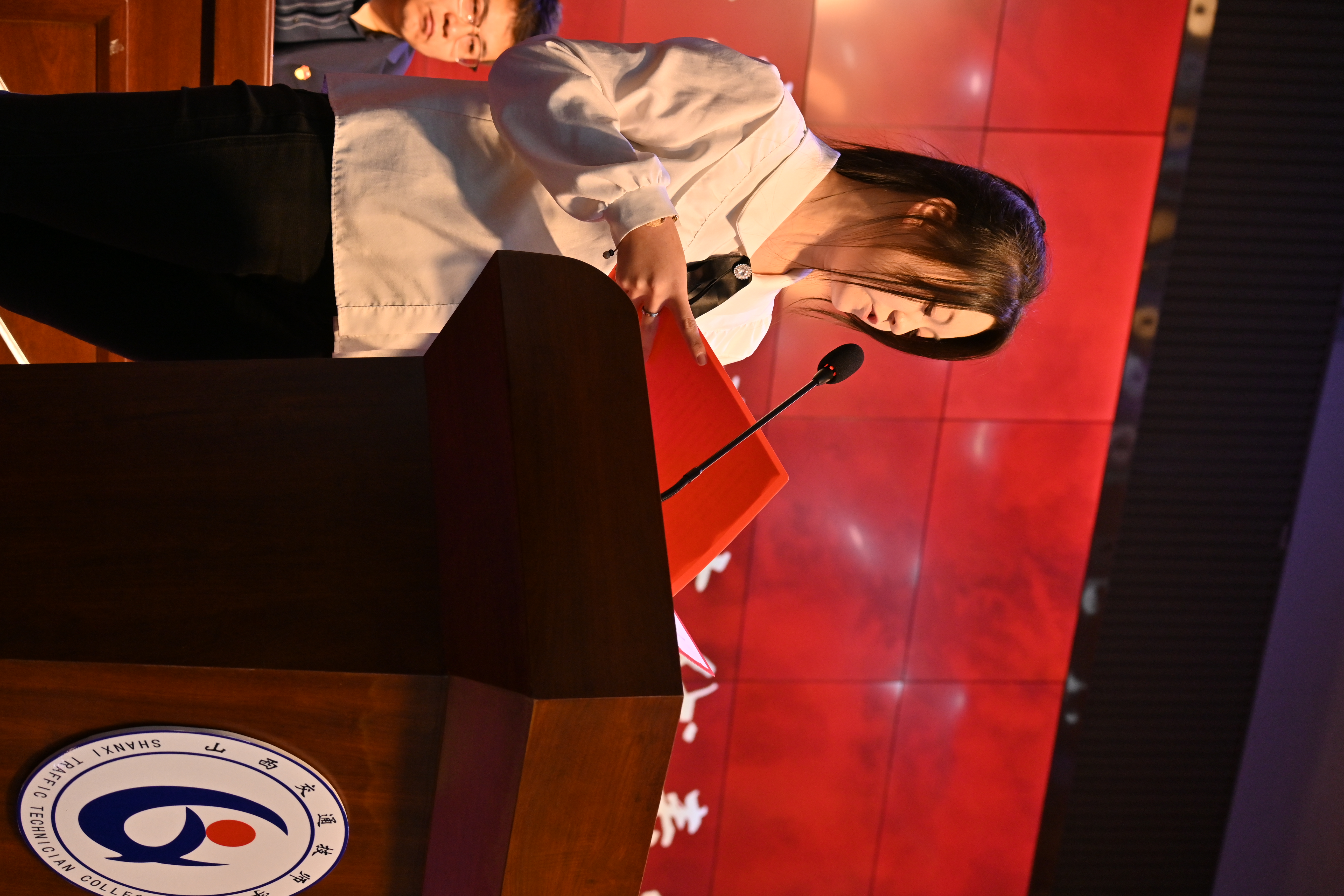 数字媒体技术2302T班白思靖同学作为高年级优秀学生代表从“敢于尝试、突破自我”“善于合作、借力成长”“勇于展示、让努力被看见”三个方面分享了自己在校两年来专业技能和综合素质提升的收获与感悟,为新生学习生活送上专属指引。