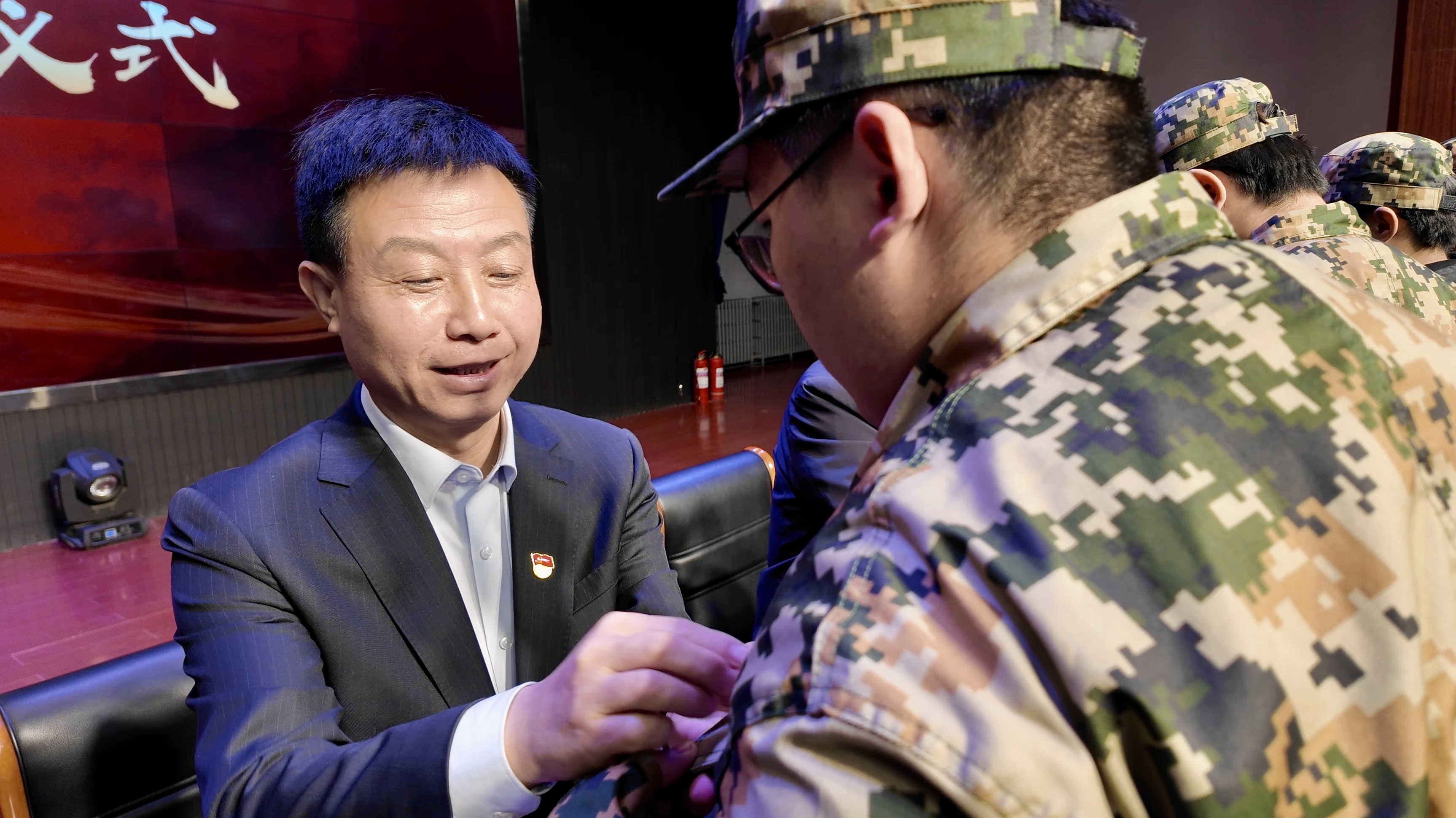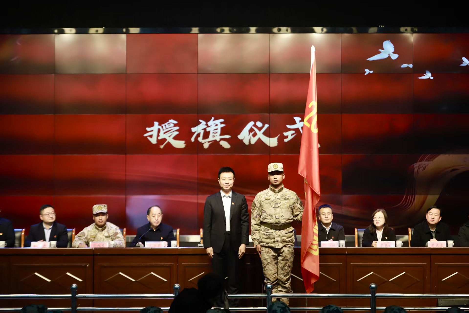 党委书记杨建国为军训队伍授旗,军训教官付明宇接旗,正式启动军训。飘扬的旗帜凝聚着“不怕苦、敢拼搏”的青春力量,将成为军训之旅的精神象征。