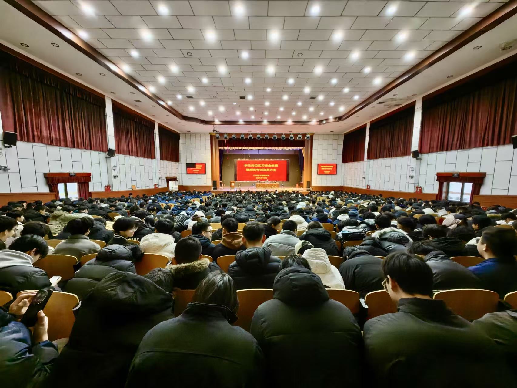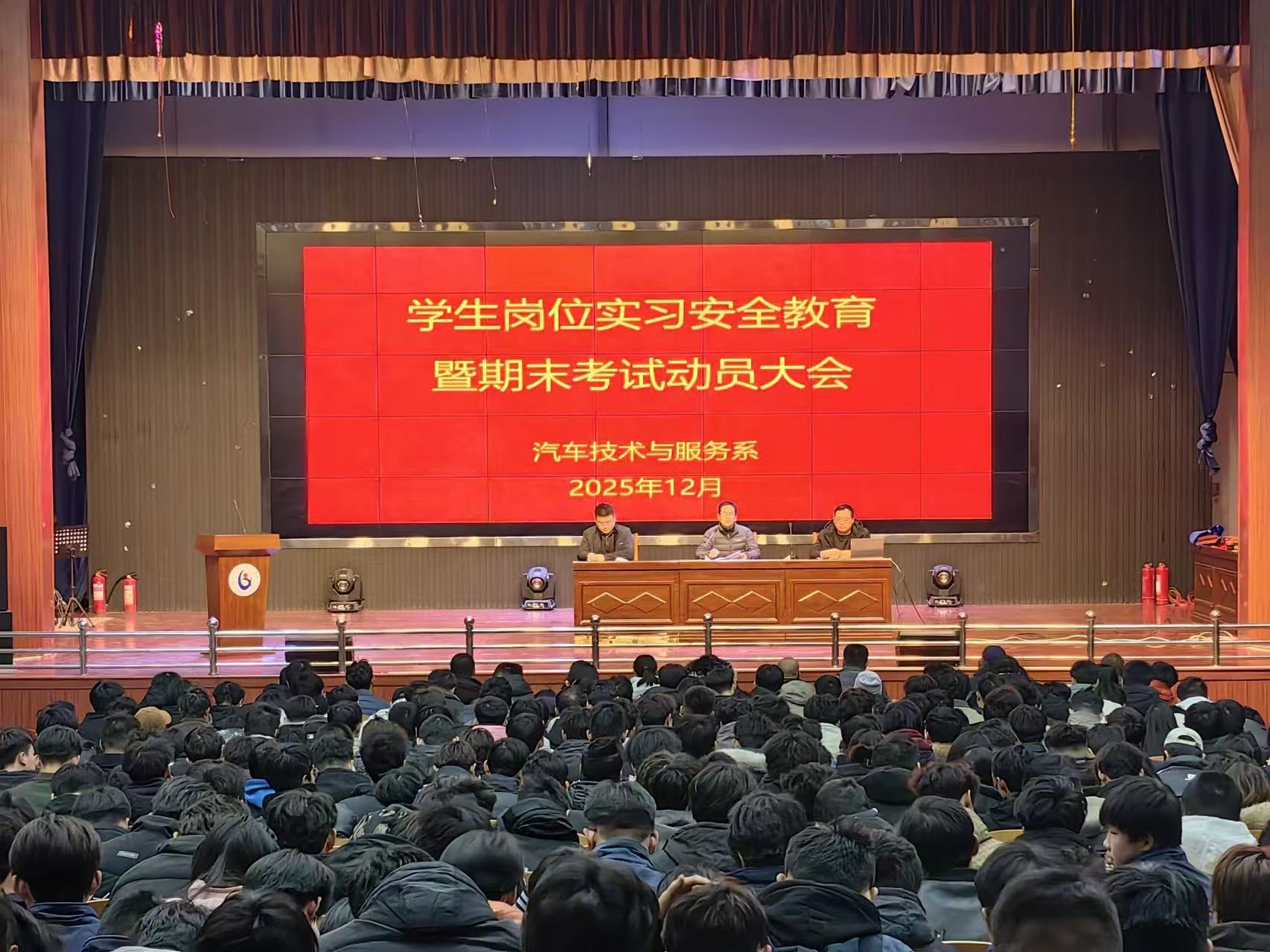 12 月 30 日下午,汽车技术与服务系在学院礼堂召开学生岗位实习安全教育暨期末考试动员大会。汽车系书记张庆龙、行政第一负责人王勇勇以及全体班主任、在校学生参加会议,会议由汽车系团总支负责人郑刘贺主持。