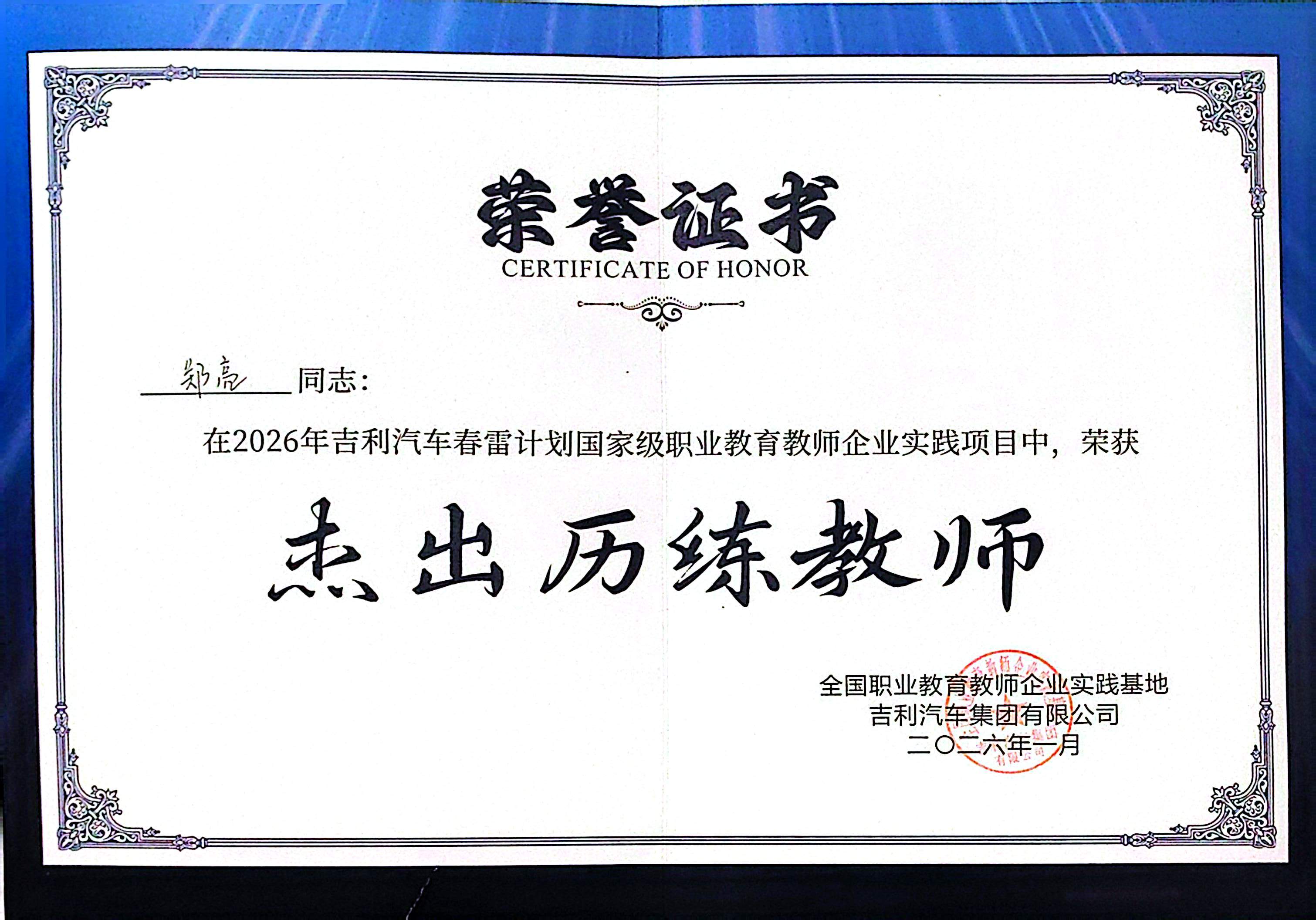 近日,我院汽车技术与服务系教师郑亮赴济南参加吉利汽车集团“春雷计划”2026年国家级职业教育教师匠心技能培训。凭借优异表现,在全国36位参训教师中脱颖而出,获评“杰出历练教师”。