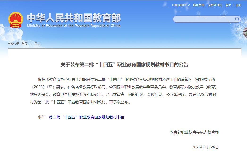 1月26日,中华人民共和国教育部网站发布《关于公布第二批“十四五”职业教育国家规划教材书目的公告》,公布了第二批“十四五”职业教育国家规划教材名单。我院《新能源汽车动力电池及其管理系统检修》《智慧物流设施设备》两部教材成功入选,这充分展现了学院在教材建设方面的扎实成效。此前,刘金凤老师主编的《桥涵施工技术(第2版)》入选首批“十四五”职业教育规划教材书目。