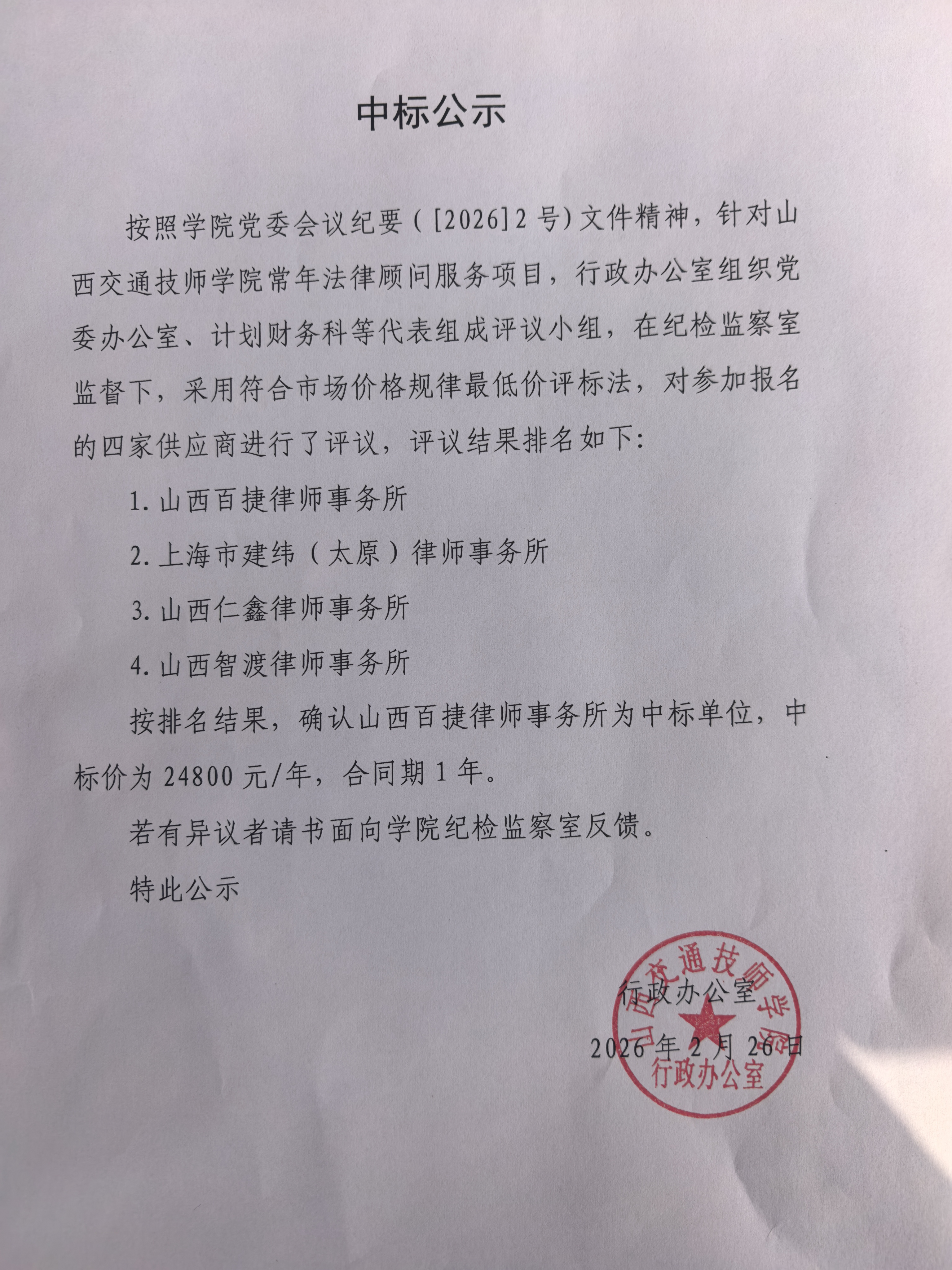山西交通技师学院常年法律顾问服务项目中标公示