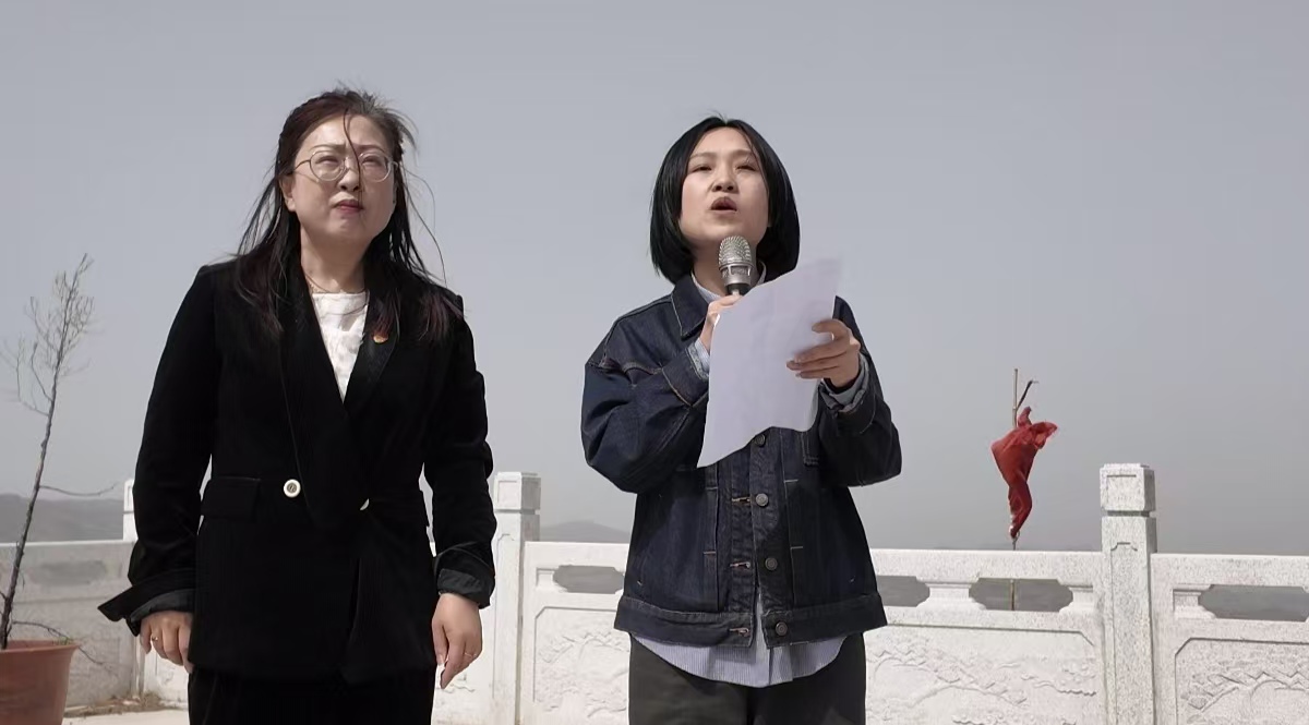 随后,共青团员代表朗诵《青松礼赞》,铿锵有力的诵读声回荡在陵园上空,深情赞颂了革命先烈如青松般坚韧不拔、傲然挺立的崇高气节。全体青年发出“请党放心、强国有我”的铮铮誓言,充分展现了新时代团员青年传承红色基因、勇担青春使命的昂扬风貌。