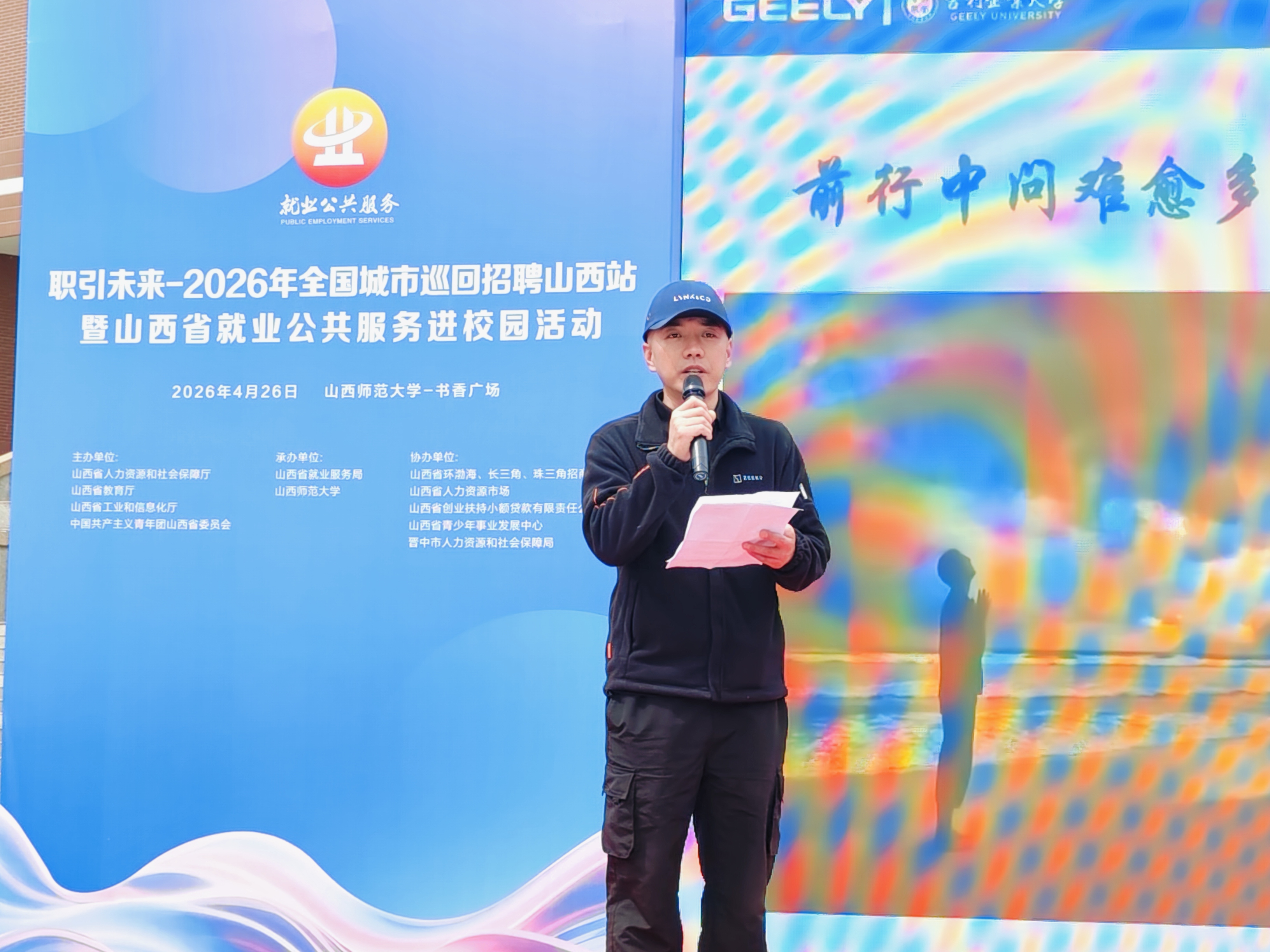 4月26日,由山西省人力资源和社会保障厅、山西省教育厅、山西省工业和信息化厅、共青团山西省委联合主办,山西省就业服务局、山西师范大学承办的“职引未来-2026年全国城市巡回招聘山西站暨山西省就业公共服务进校园活动”,在山西师范大学书香广场举办。我院优秀毕业生、吉利集团技能大师、全国技术能手吴瑞胜受邀作为技能成才代表参加本次活动,分享职场经验。